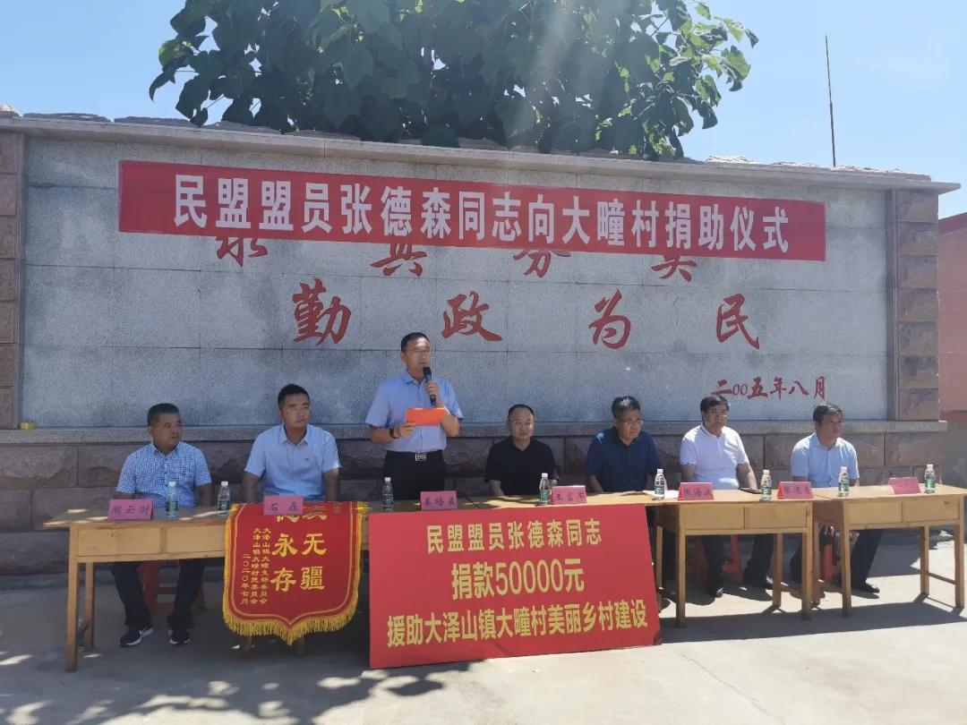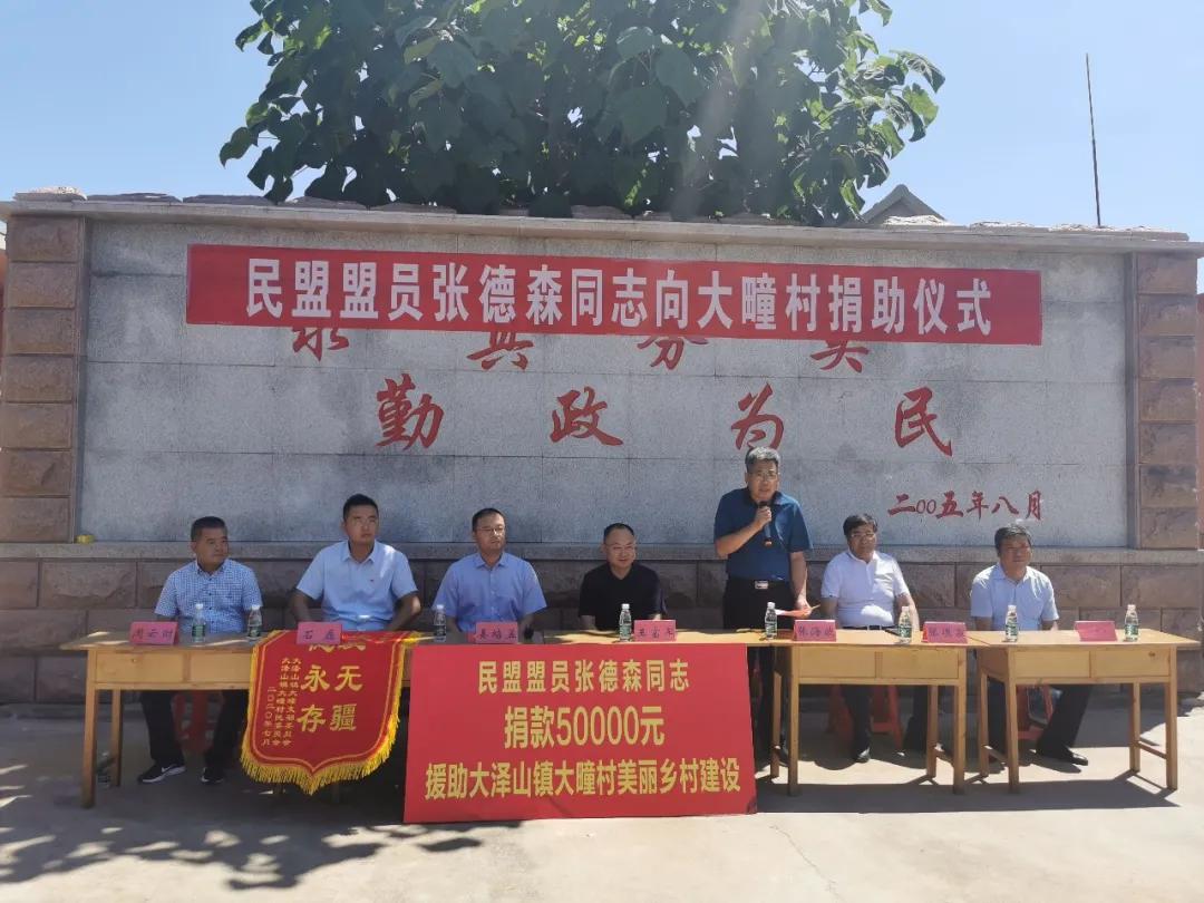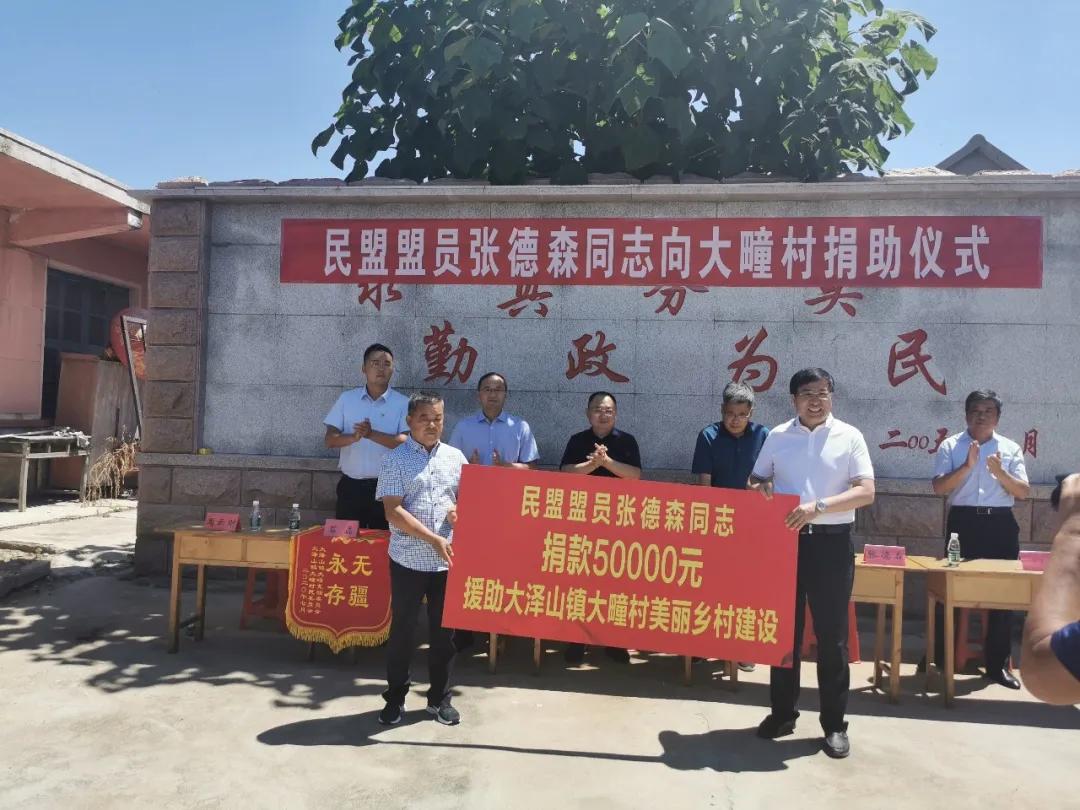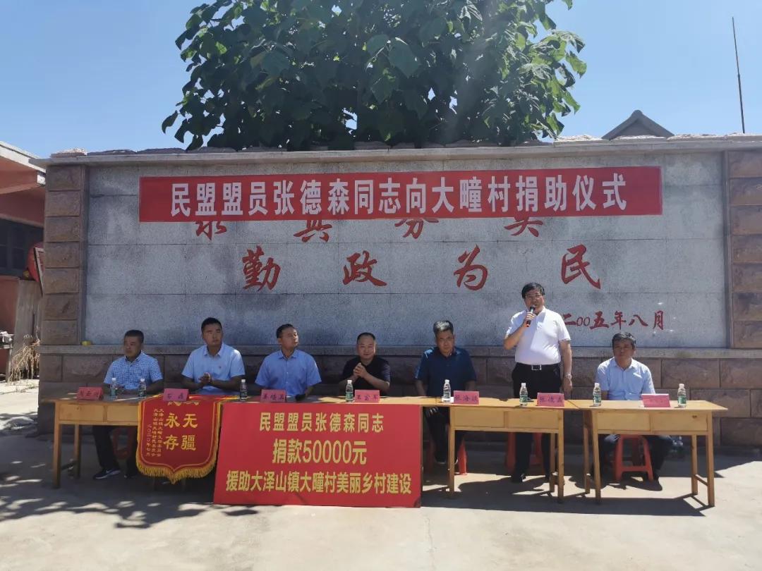 7月25日,民盟盟员张德森向大疃村捐助仪式在大泽山镇大疃村举行。民盟青岛市委委员、青岛大森酒业集团董事长张德森,中共平度市委常委、统战部长王富军,中共平度市委统战部常务副部长张海波,大泽山镇党委副书记、镇长姜培孟,大泽山镇宣传统战委员石磊,大疃村党支部书记周云财出席捐助仪式。