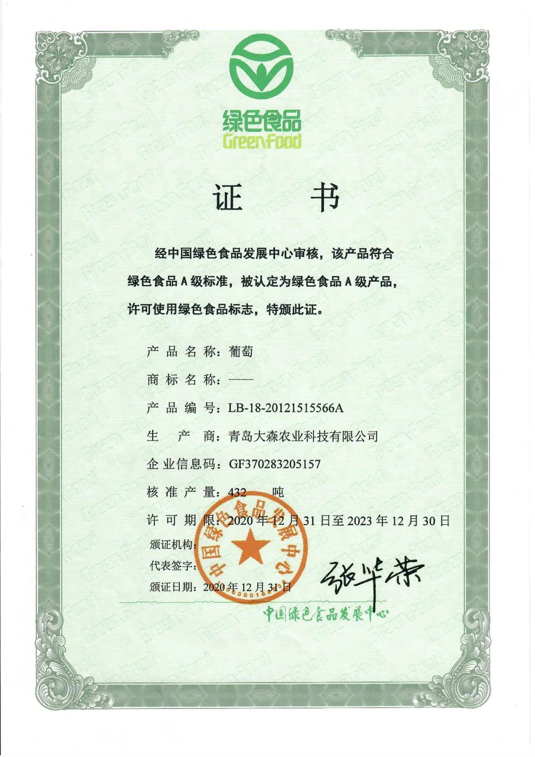 经中国绿色食品发展中心审核,大森葡萄基地(大森庄园)葡萄符合绿色食品A级标准,被认定为绿色食品A级产品,许可大森庄园葡萄使用绿色食品标志。这是自大森葡萄酒获得“中国驰名商标”、“中华文化名酒”、“中国绿色食品”、“国际葡萄酒大奖赛金奖”、“钓鱼台宴会用酒”等荣誉称号后的又一殊荣。