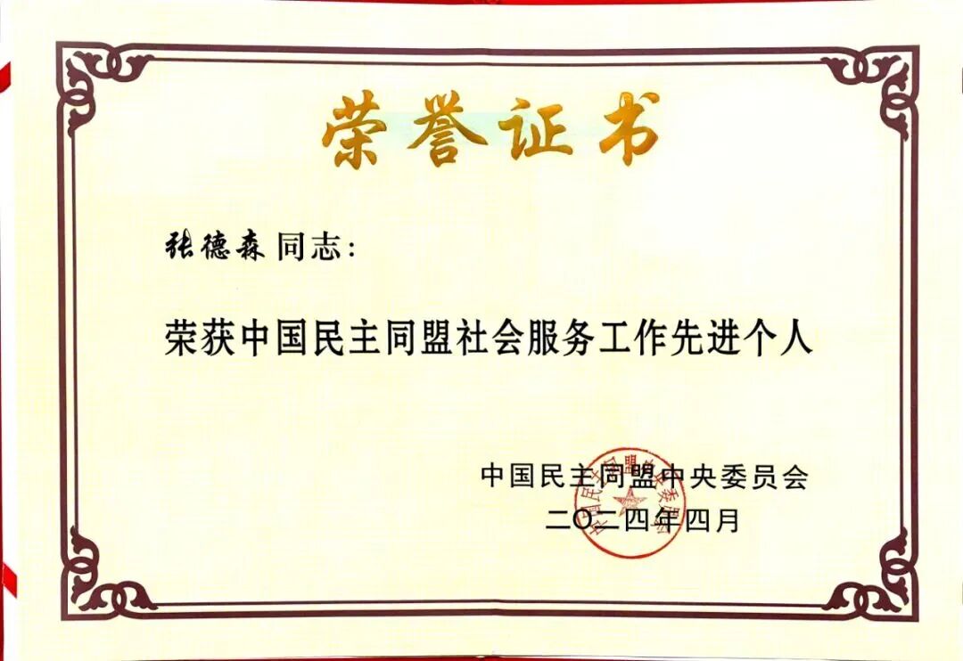 张德森董事长荣获“中国民主同盟社会服务工作先进个人”荣誉称号